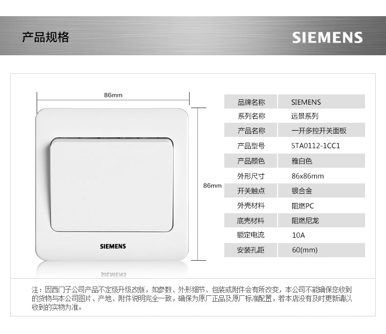 西门子(SIEMENS) 开关插座面板远景系列一开多控中途中途开关(雅白色)