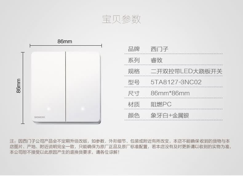 西门子(SIEMENS) 西门子开关插座面板二开双控带LED指示灯睿致系列象牙白