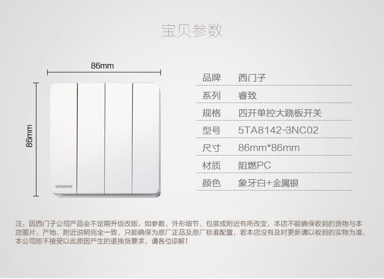 西门子(SIEMENS) 开关插座面板四开单控官方旗舰店睿致系列象牙白钛银睿智开关