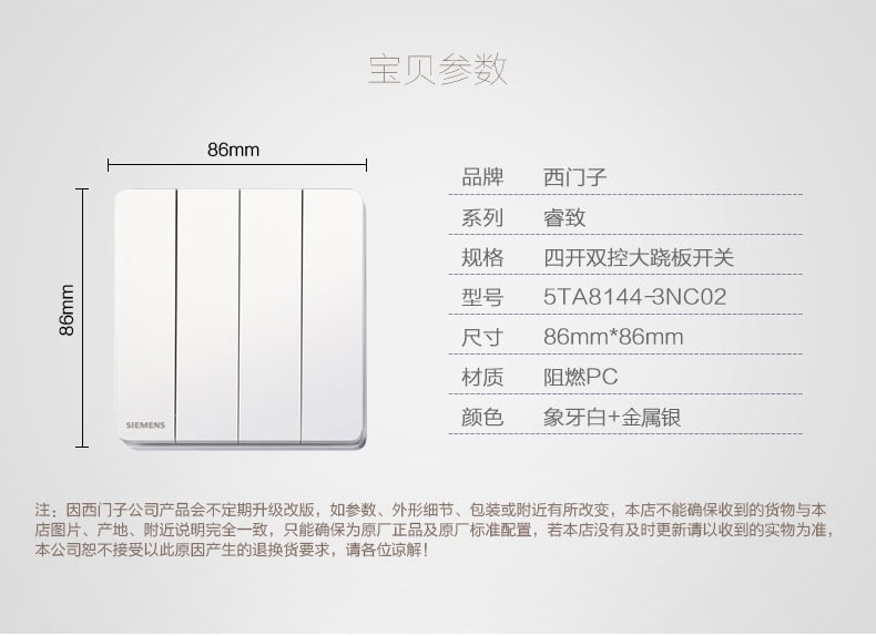 西门子(SIEMENS) 开关插座面板四开双控官方旗舰店睿致系列象牙白钛银睿智开关