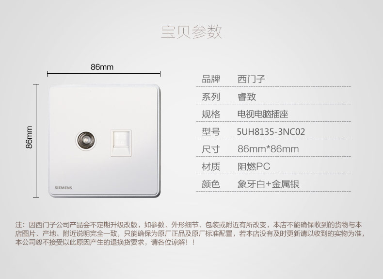 西门子(SIEMENS) 开关插座面板远景系列雅白色一开单控(单开单控/单联单控)带荧光 (单只装)