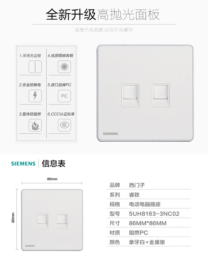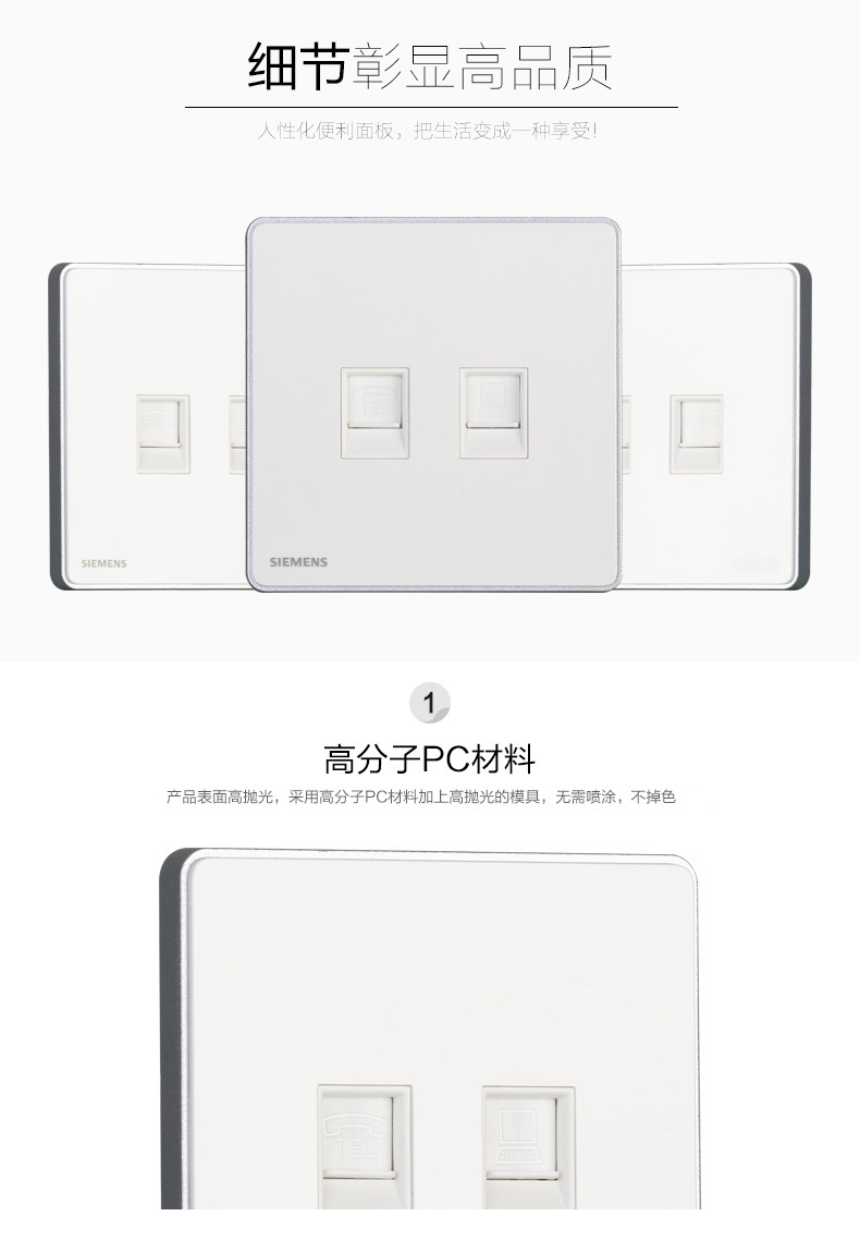西门子(SIEMENS) 西门子开关插座面板 两位电话电脑弱电插座 睿致系列象牙白钛银