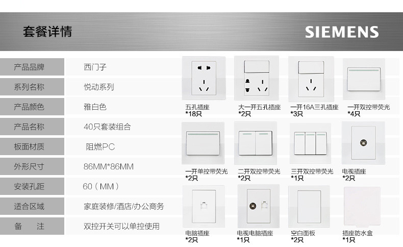 西门子(SIEMENS) 西门子开关插座面板 悦动系列雅白色套装套餐 40只装