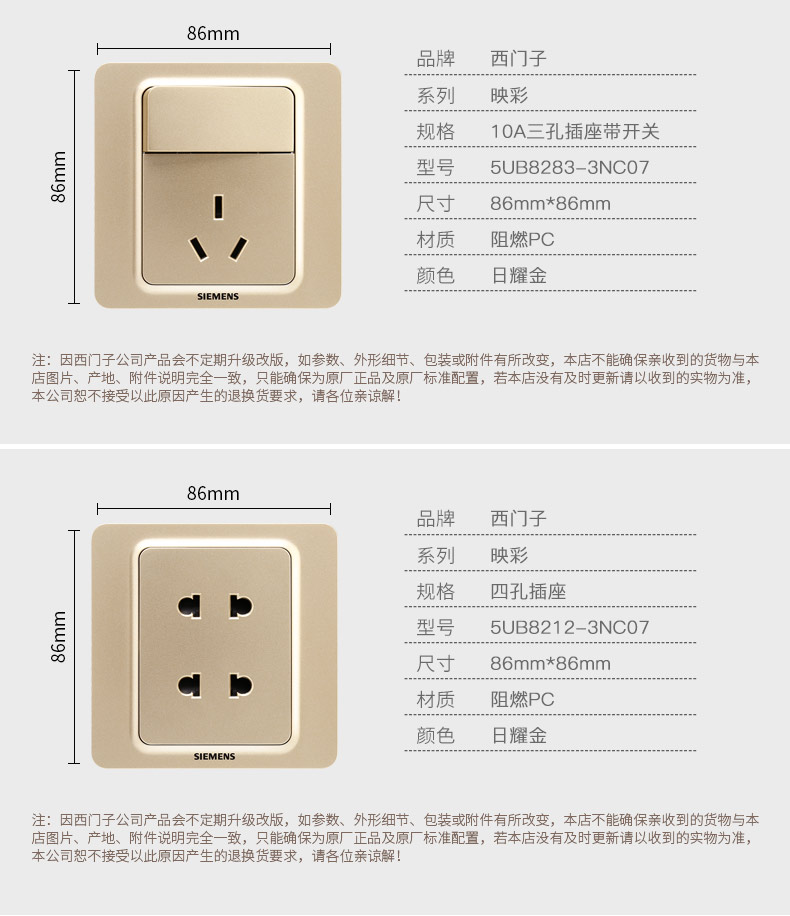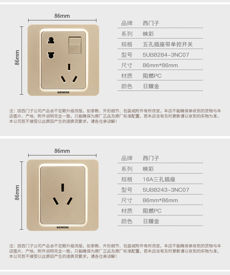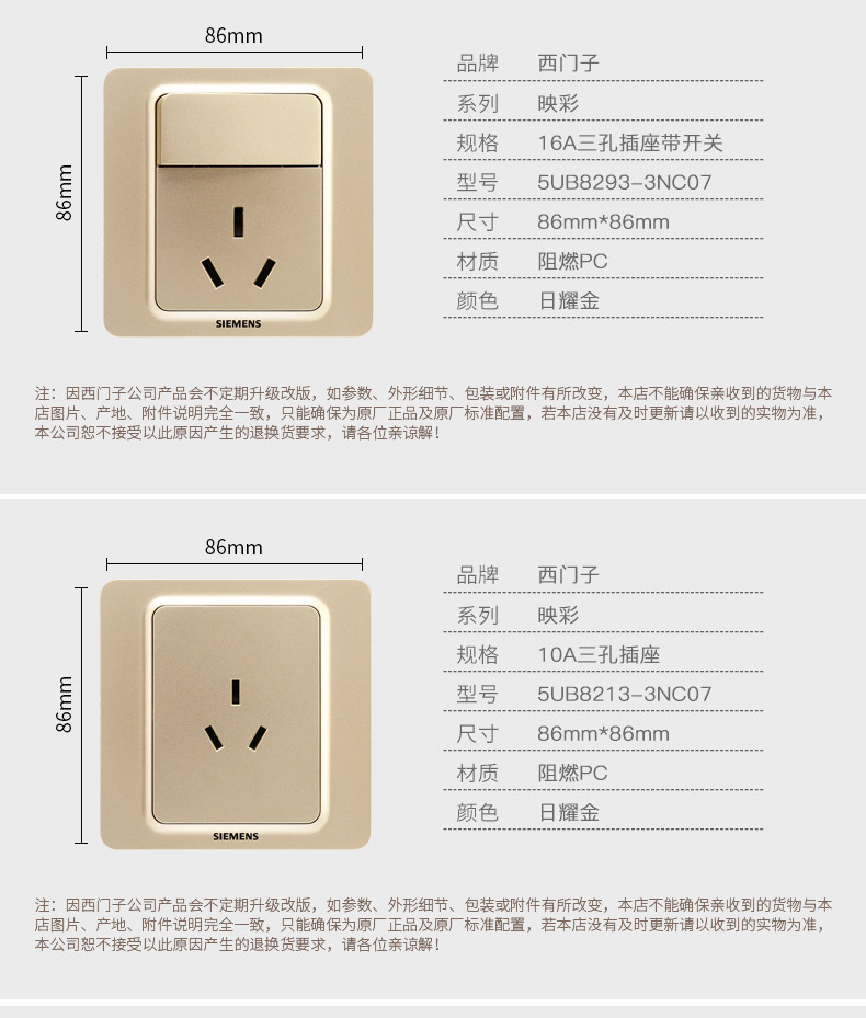 西门子(SIEMENS) 开关插座面板 映彩系列日耀金色插座系列 五孔插座二三插