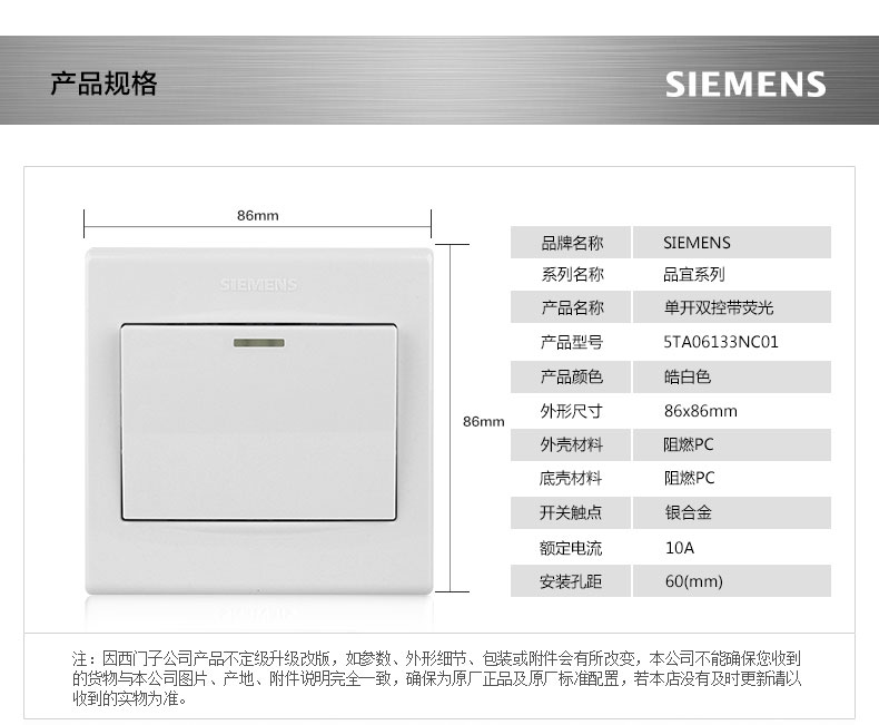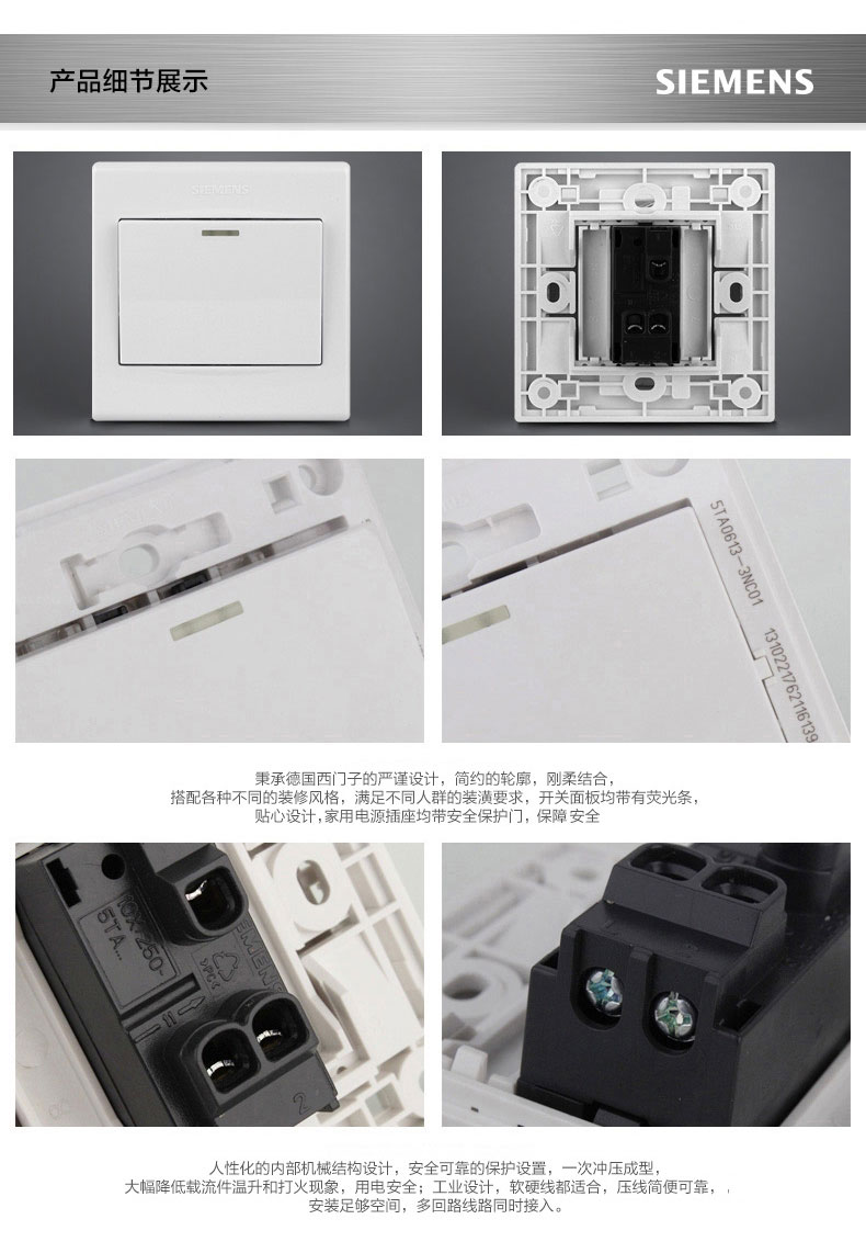 西门子(SIEMENS) 西门子开关插座面板 品宜系列雅白一开双控/单联双控开关 带荧光