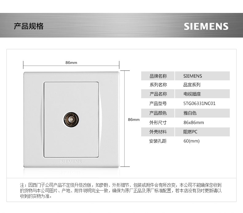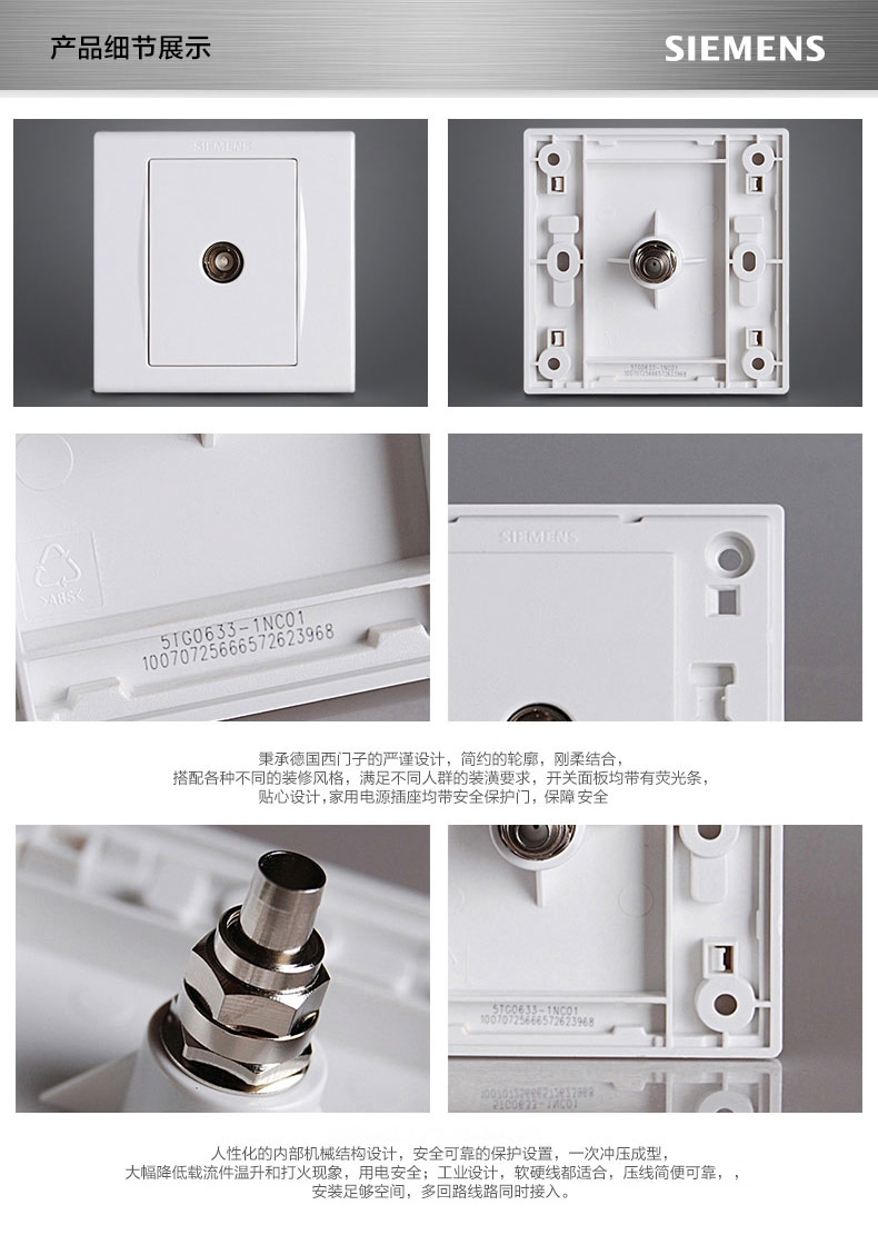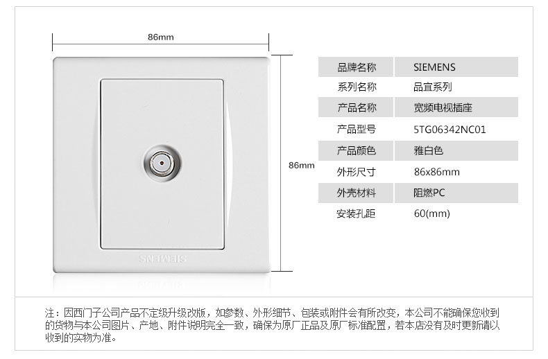 西门子(SIEMENS) 西门子开关插座面板 品宜系列雅白电视插座 宽频电视