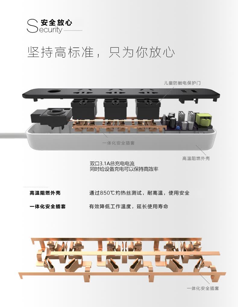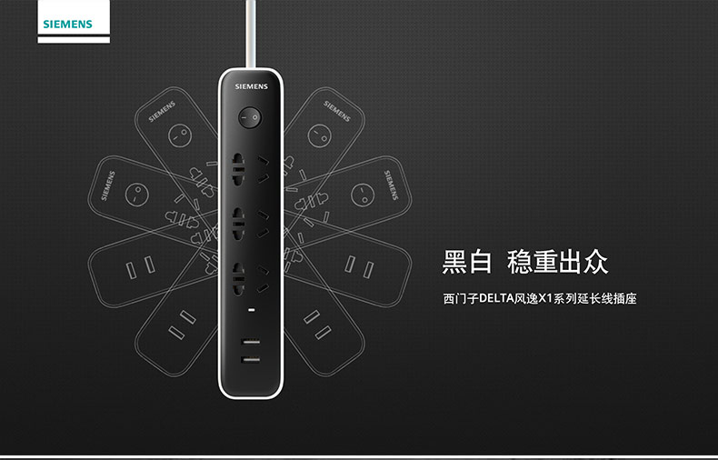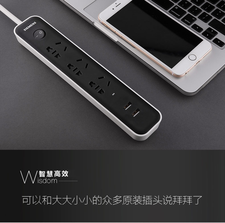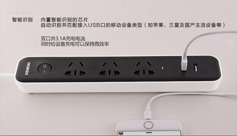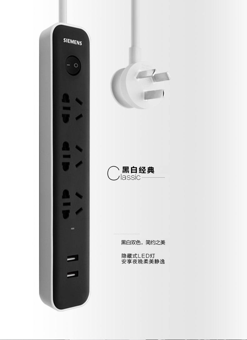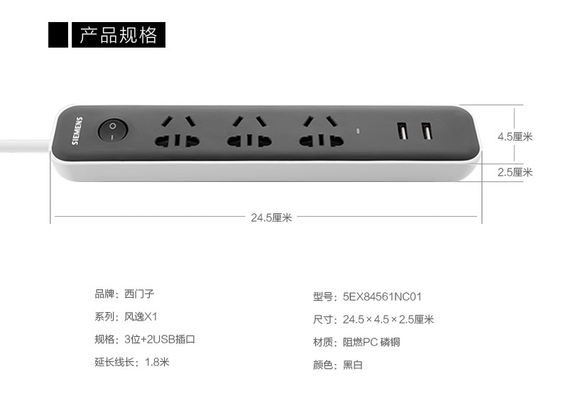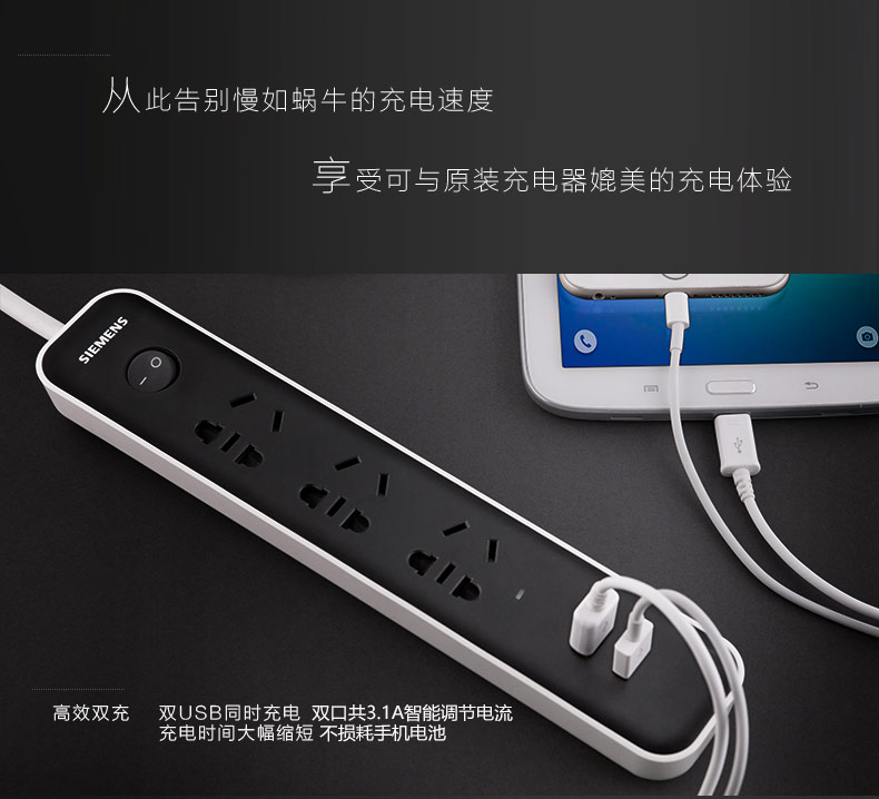 西门子(SIEMENS)插座 双USB带过载保护 接线板插排电源插线板1.8米3位排插