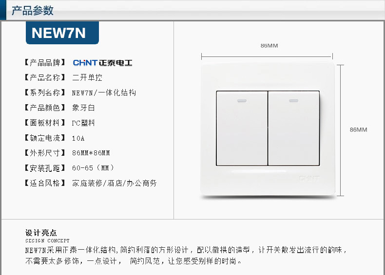 正泰(CHNT) 正泰电工 86型墙壁开关面板 NEW7N象牙白 二位开关 二开单控