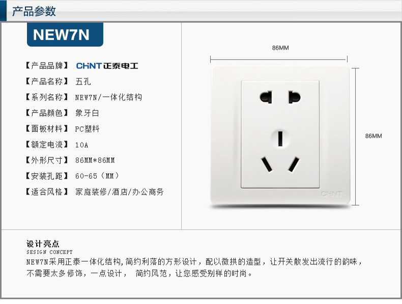 正泰(CHNT) 正泰开关插座 NEW7N象牙白 86型开关插座面板墙壁电源插座五孔插座 单只