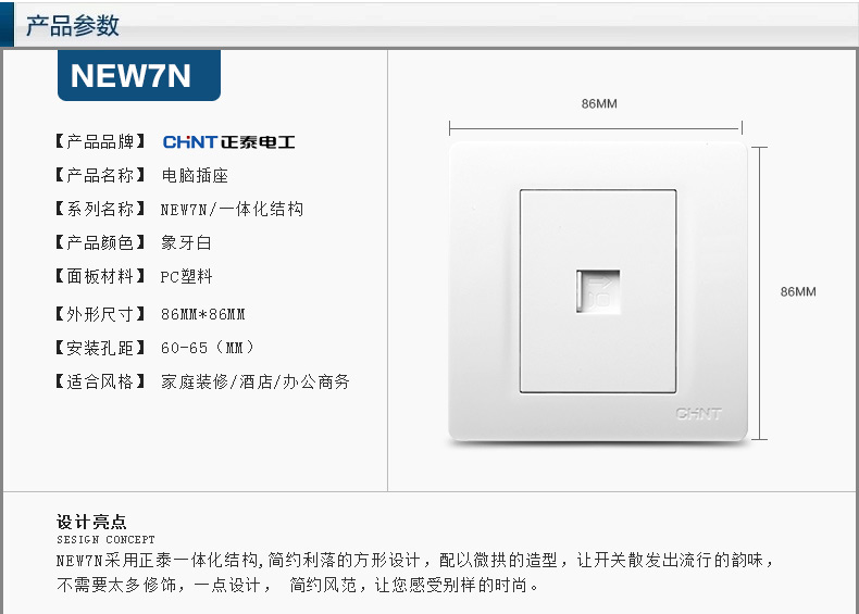 正泰(CHNT) 正泰电工 86型墙壁开关插座 NEW7N象牙白 电脑插座
