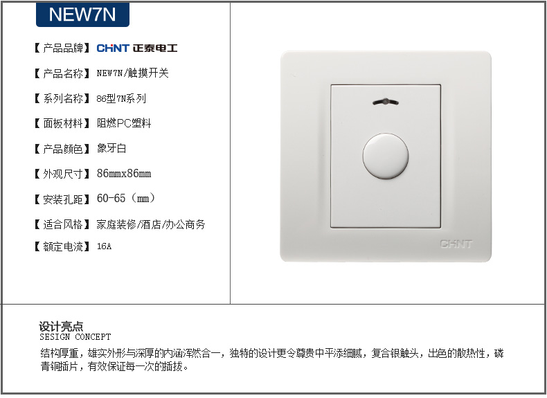 商品名称:正泰(CHNT) 正泰电工 86型墙壁开关插座 NEW7N象牙白 触摸开关面板