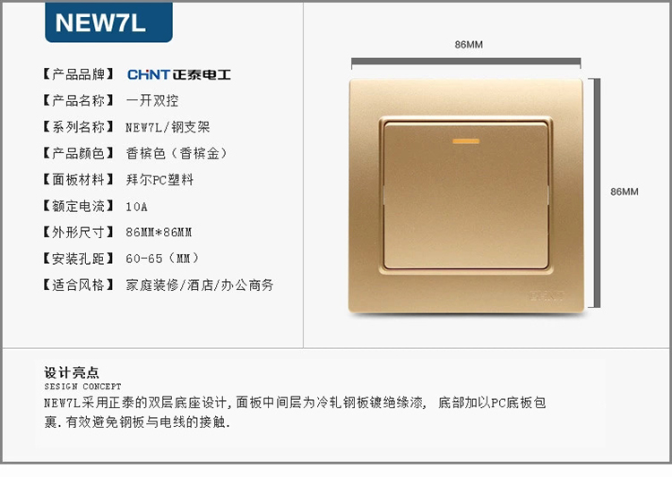 正泰(CHNT) 正泰电工 钢架墙壁开关 NEW7L内嵌钢架香槟色 一开双控开关