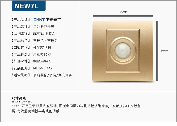 正泰(CHNT) 正泰开关插座面板 7L香槟金人体感应红外感应开关面板