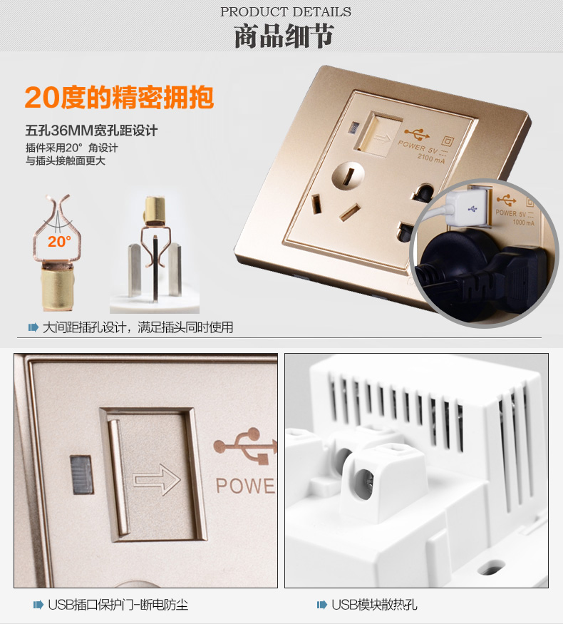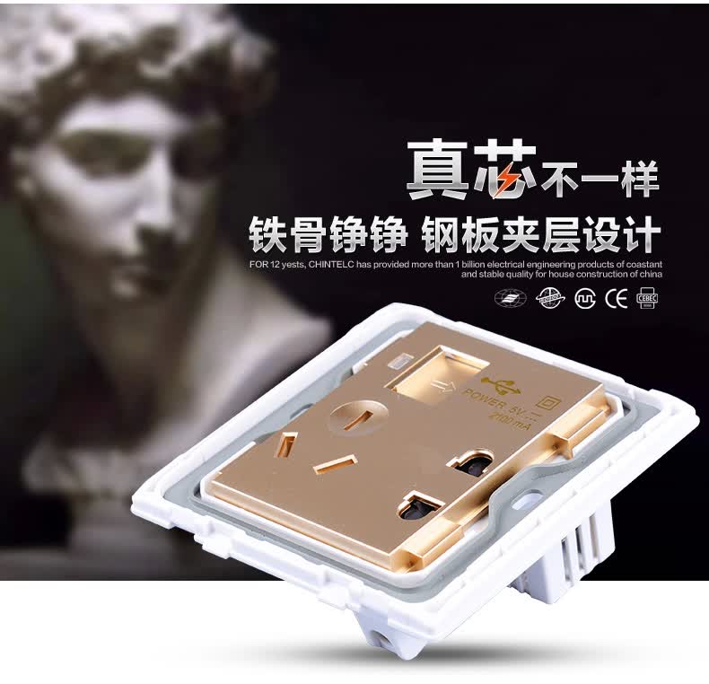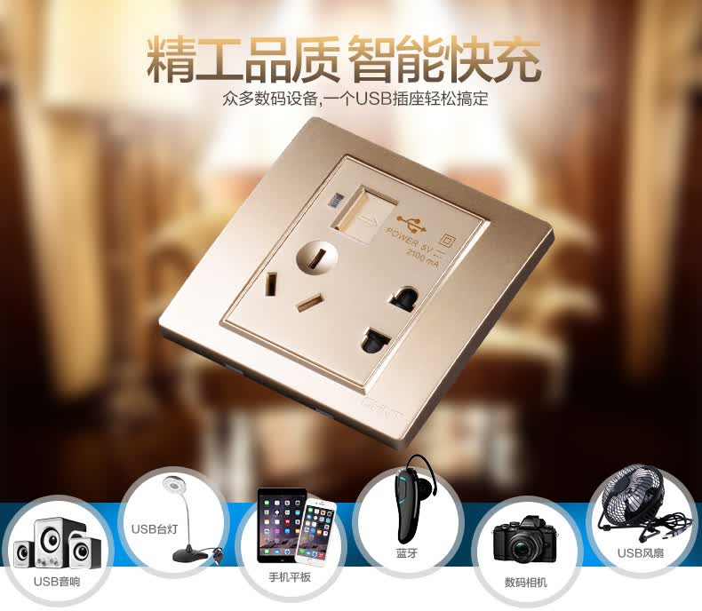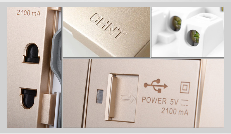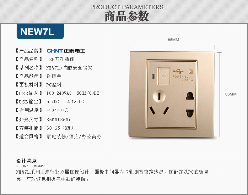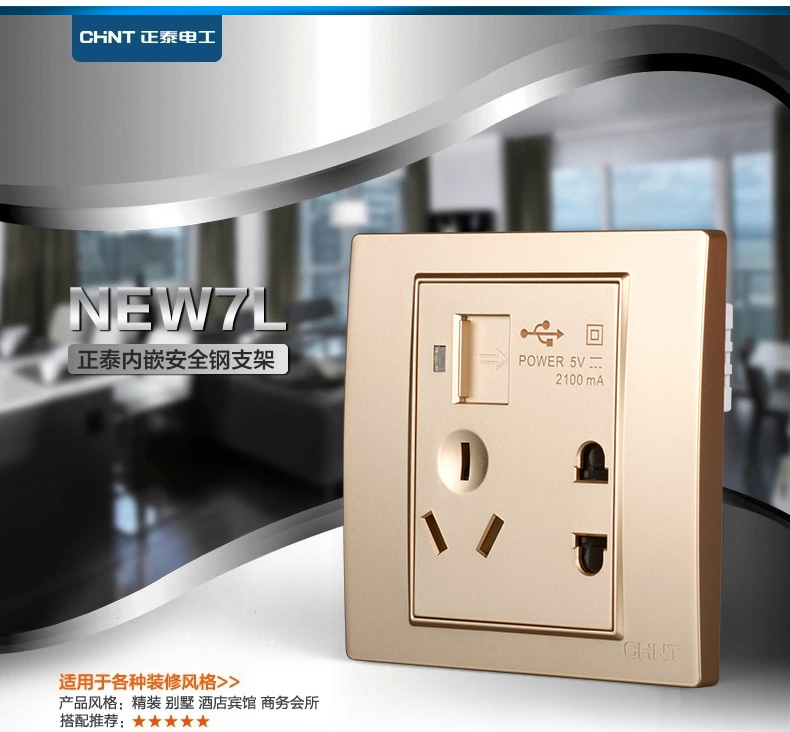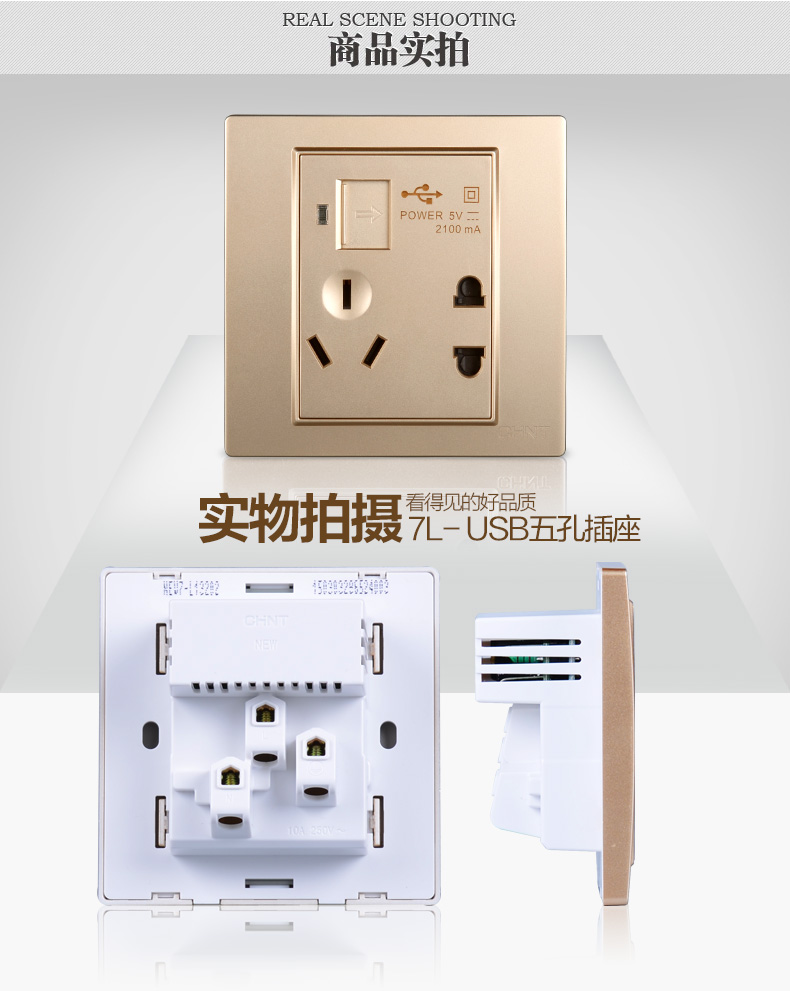 正泰(CHNT) 正泰开关插座面板 7L香槟金五孔带USB 2.1A变压直流5V充电插座
