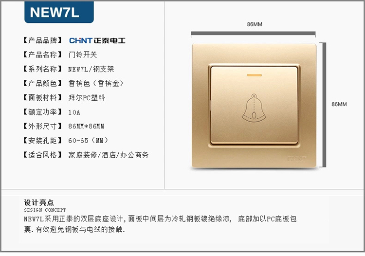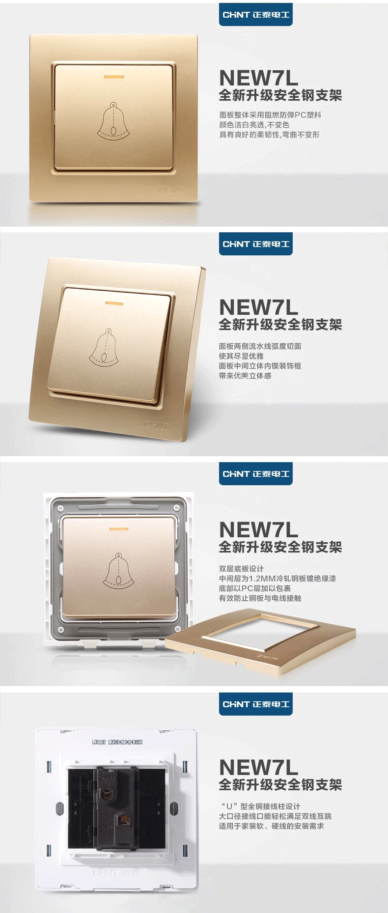 正泰(CHNT) 正泰电工 钢架墙壁开关插座面板 NEW7L香槟金色 开关门铃面板