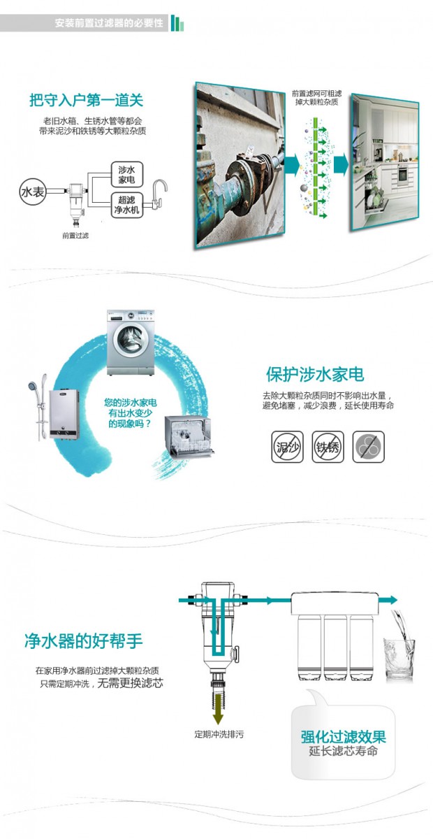 预留自动电控插件,通过升级排污旋钮组件,来实现自动排污功能。 反冲洗前置与其他类型前置区别,反冲洗前置相比顺冲型、型虹吸、叠片式过滤器产品在技术上有了很大一步的提高,冲洗设计合理"正冲、反冲随心所欲"将杂质彻底的冲出,杜绝因杂质累计所造成的二次污染,使用前置过滤器后可以大大延长净水及纯水设备滤芯寿命。