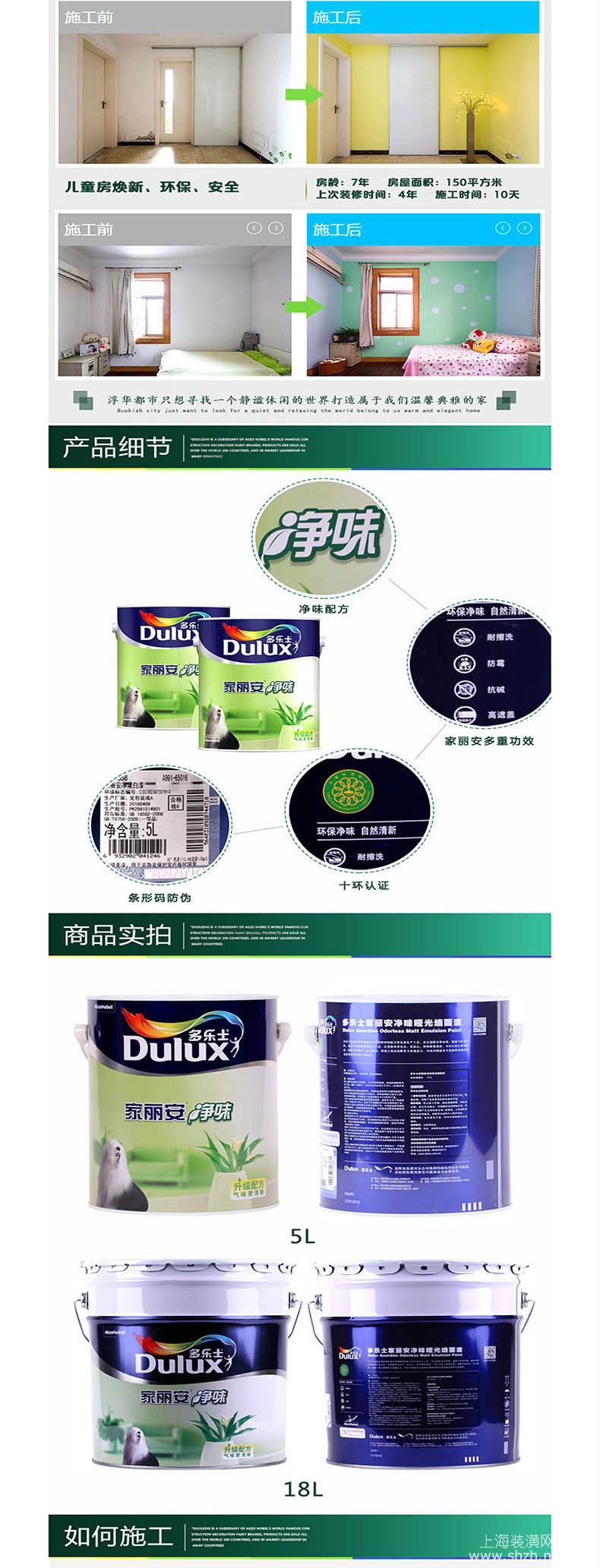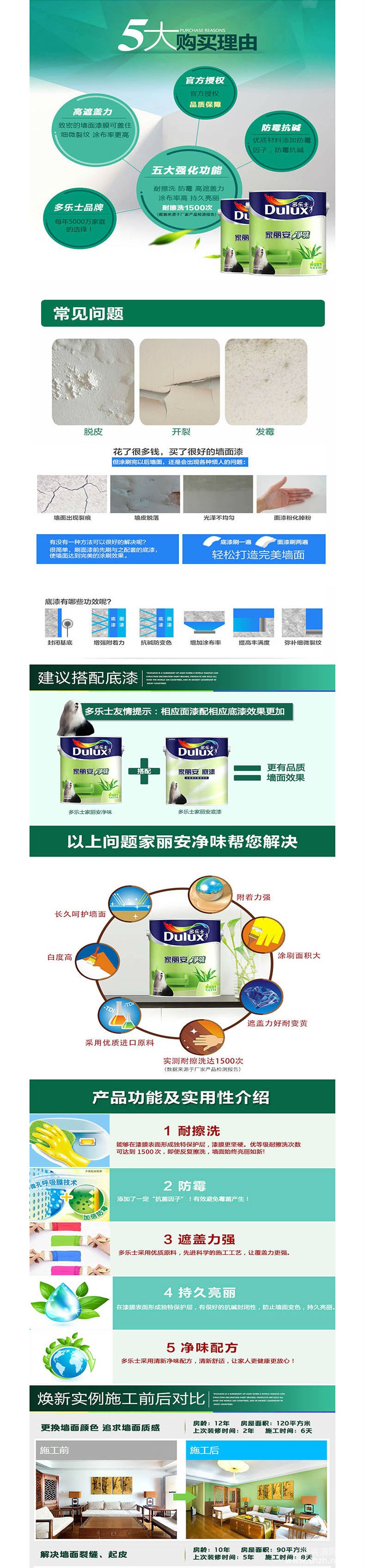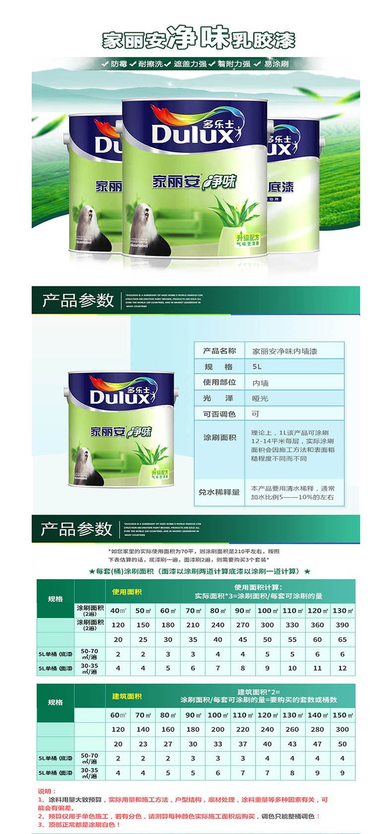 官方授权,品质保障。高遮盖力,致密的墙面漆膜可盖住细微裂纹,涂布率更高。优质材料添加防霉因子,防霉抗碱。每年5000万家庭的选择。