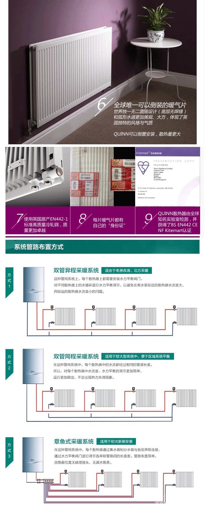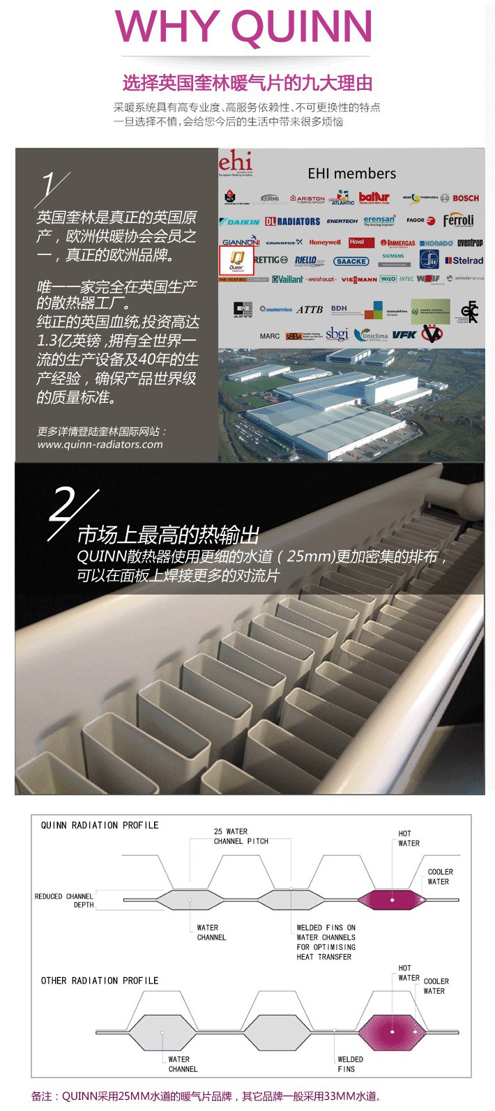 奎林暖气片是目前世界上最节能、最环保、使用寿命最长的钢板式暖气片,是英国第一家通过英国国家实验室BS认证、欧盟EN442认证的散热片品牌, 在欧洲享有极高的知名度。奎林品牌散热器隶属于英国国营公司AVENTAS集团,拥有40多年的悠久历史,是唯一一家在英国本土生产的散热器品牌。